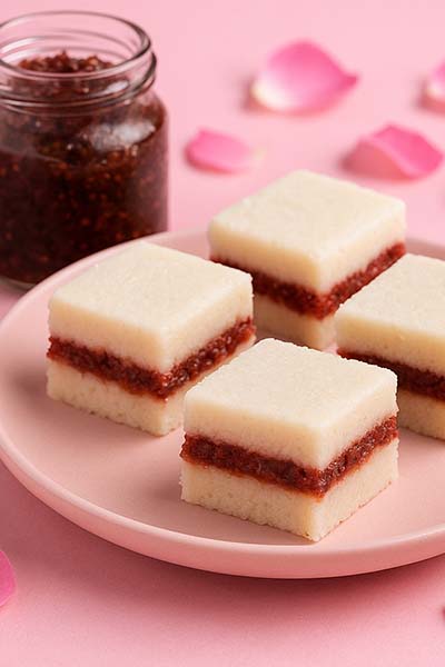 Sweet, floral, indulgent Gulkand-infused traditional treat.